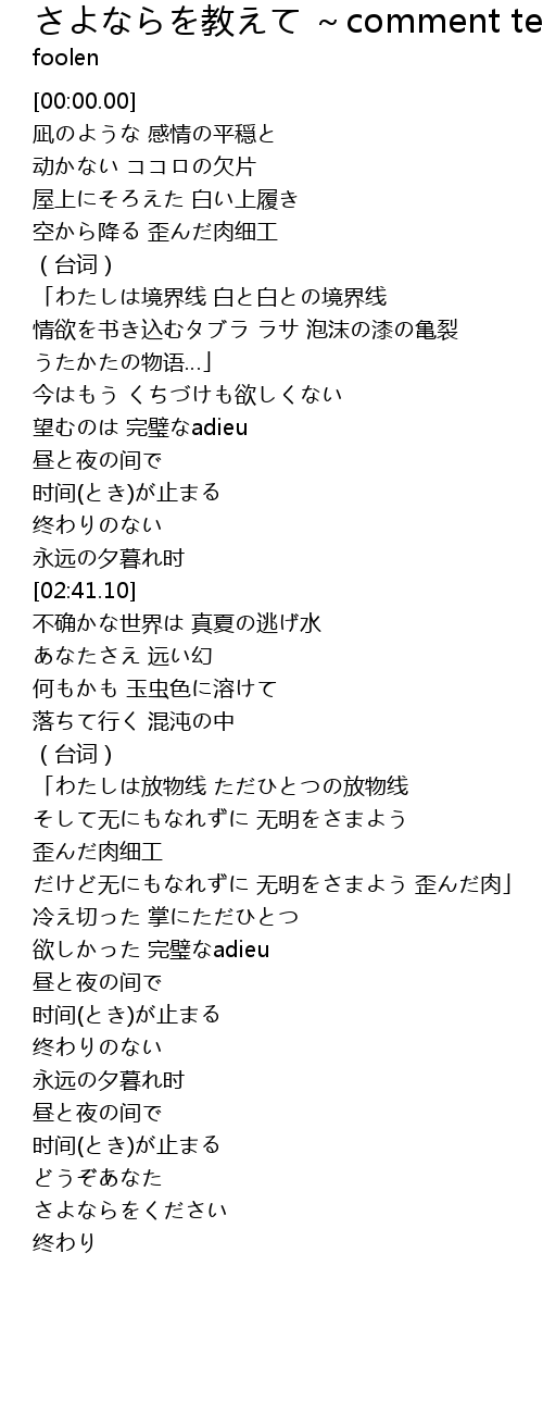 さよならを教えて歌詞Sous aucun prétexte, je ne veux Avoir de réflexes malheureux Il faut que tu m'explique un peu mieux Comment te dire adi 今すぐKKBOXを使って好きなだけ聞きましょう。歌詞 かな 638打 ※難易度の目安: (簡単) ~ (難しい) ※ 秒 は終了時間、 打 は終了までのおおよそのキー数を表しています。 ※ かな は仮名と句読点等のみのタイピング、 英語 は英語モードで作成されたタイピングです。 ※ 英字 数字 記号 はそれぞれの Comment te dire adieu さよならを教えて(その3) 11年03月03日 テーマ: フランス語 昨日の続きです。 幸い、 ペピートさん に喜んでいただけたので、調子に乗って、「さよならを教えて」のカタカナ化歌詞を一気に入力してみました。 しつこいようですが